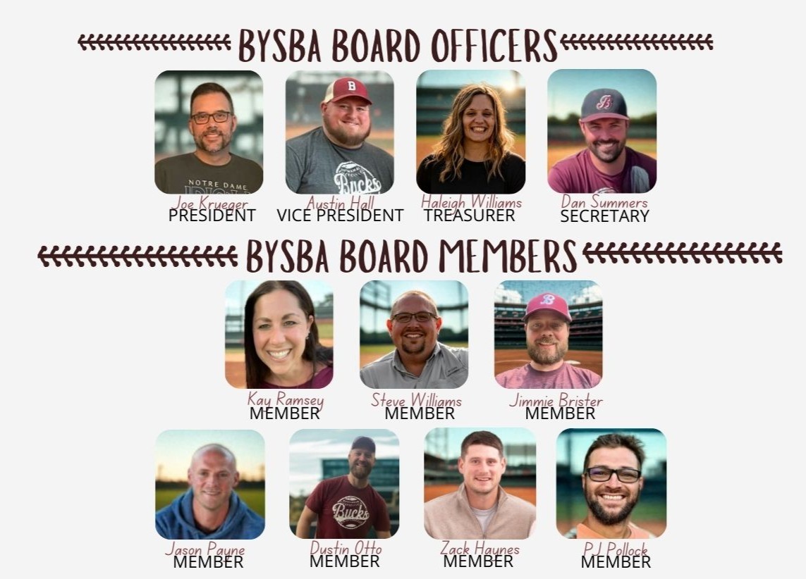 The Buchanan Youth Softball Baseball Association (BYSBA) is proudly led by a dedicated group of board members who work tirelessly to create a positive and inclusive environment for young athletes in the Buchanan area. The current board includes Joe Krueger as President, Austin Hall as Vice President, Haleigh Williams as Treasurer, and Dan Summers as Secretary. Supporting them are board members Kay Ramsey, Jimmie Brister, Dustin Otto, Steve Williams, PJ Pollock, Zack Haynes, and Jason Payne. Together, they ensure the organization runs smoothly, fostering life skills, teamwork, and a love for the game through volunteer coaching and active parent involvement.